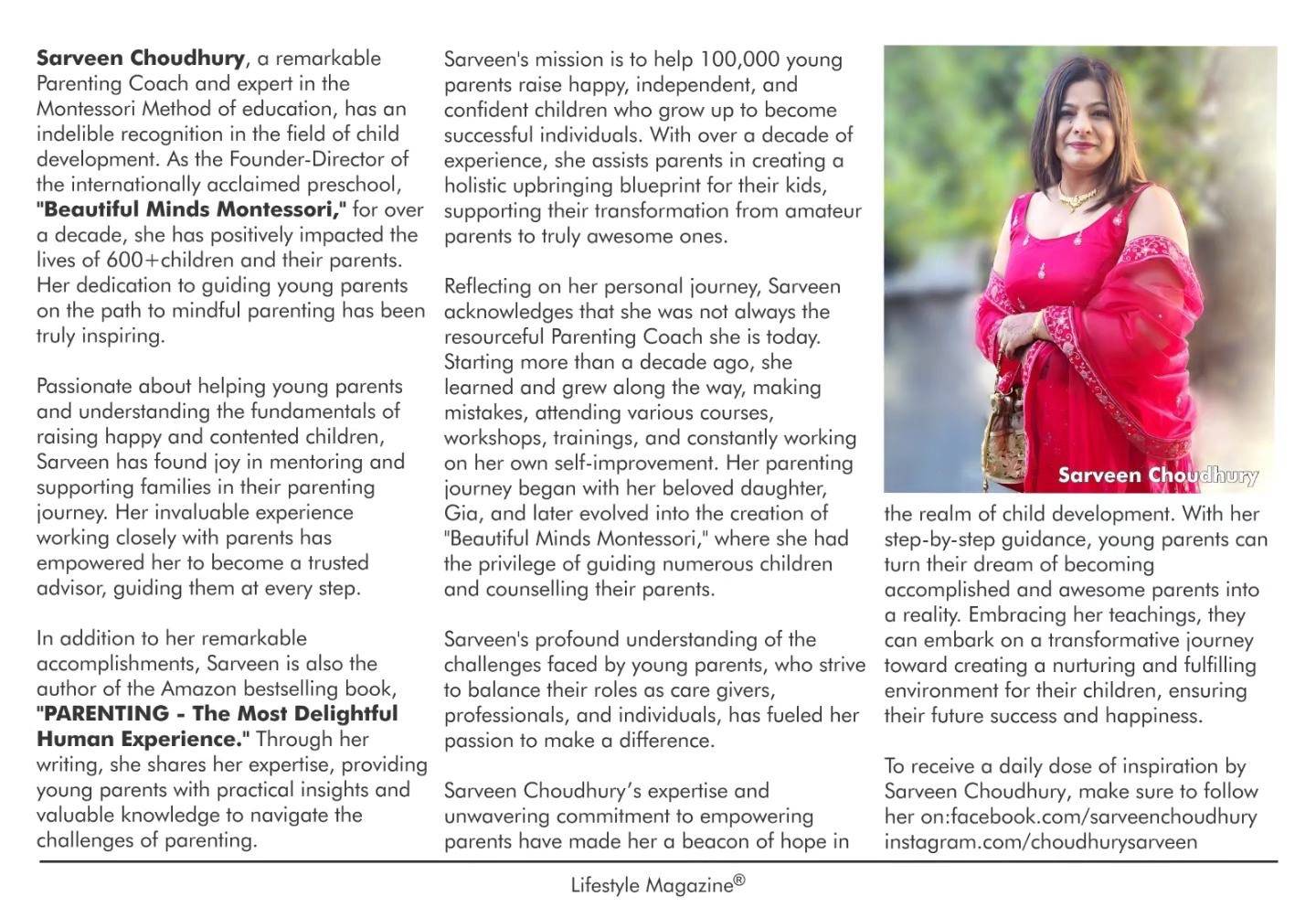 Sarveen Choudhury is a perfect blend of passion and perseverance. She is a Parenting Expert And Life Skills Coach For Young Mothers and has specialised in the Montessori Method of education.