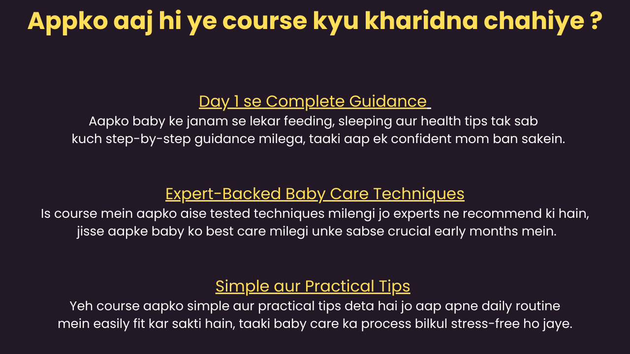 Mujhe kabhi nahi laga tha ki main itni jaldi motherhood ke responsibilities ko sambhal paungi, par is course ne mujhe ek structured plan diya. Baby care ke basic principles ko samajhna bohot zaruri hota hai, aur yeh course isi par focus karta ha.